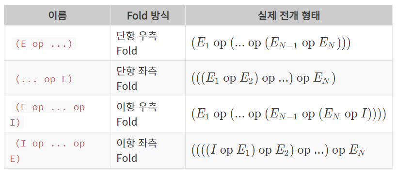 return ((((1+4) + 2) + 3) + 10); 과 같이 해석된다. 이와 같은 형태를 단항 좌측(Unary left fold) 이라고 한다.