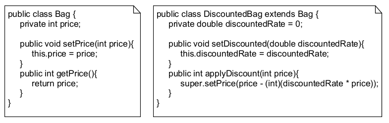 - DiscountedBag 클래스는 Bag 클래스의 가격을 설정하고 반환해주는 기능을 변경없이 상속받았다.