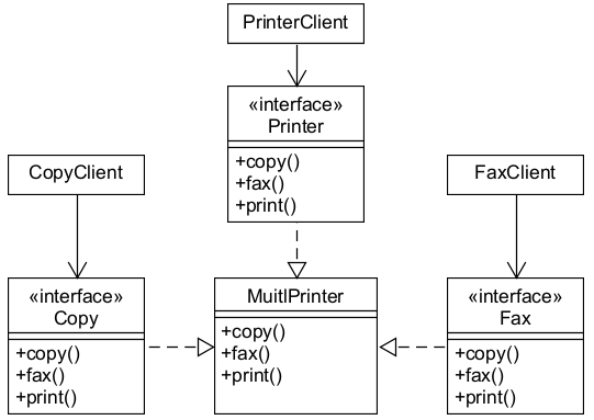 - 위와 같이 설계하면 인터페이스가 일종의 방화벽 역할을 수행해 클라이언트는 자신이 사용하지 않는 메서드(기능)에