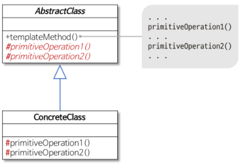 - 하위 클래스에 공통 알고리즘을 정의하고 하위 클래스에서 구현될 기능을 primitive, hook 메서드로 정의하는 클래스